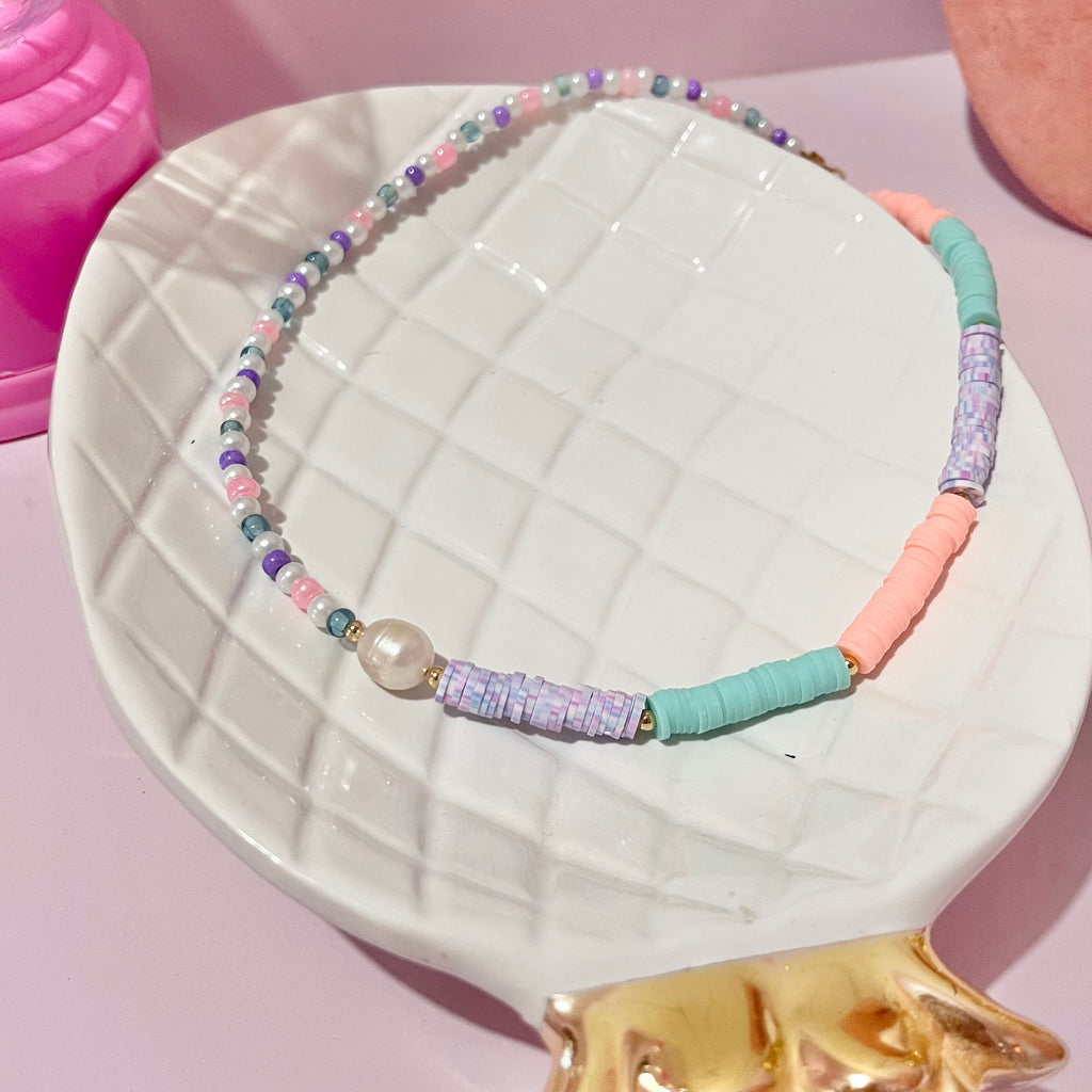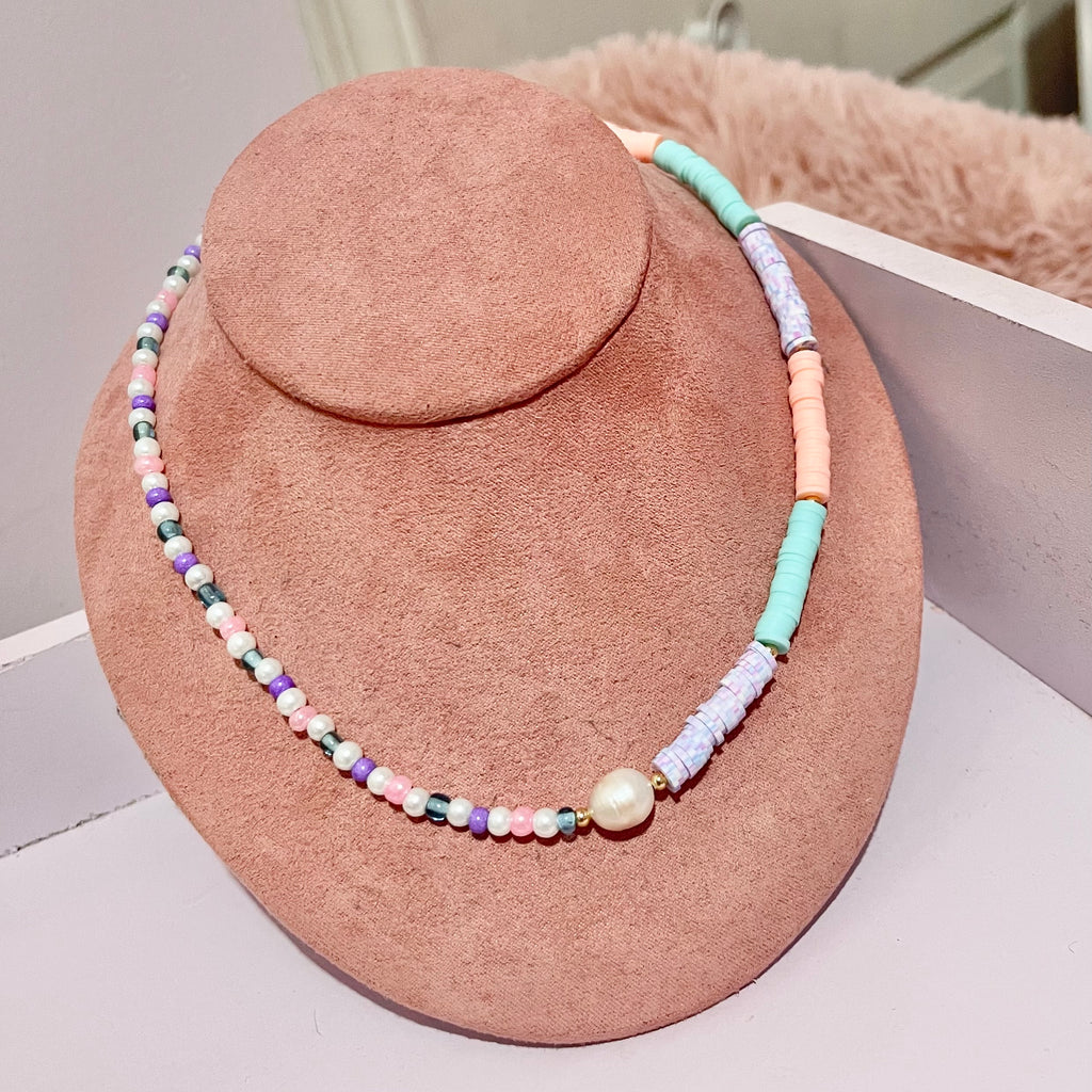 Collar: Acrílico y perla cristal, terminales, broches y bolitas doradas en chapa de oro, 40 cm con extensor.