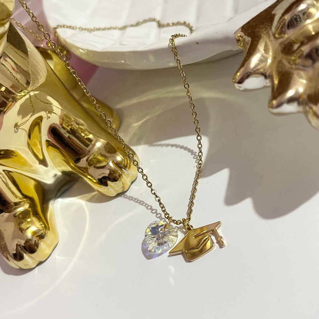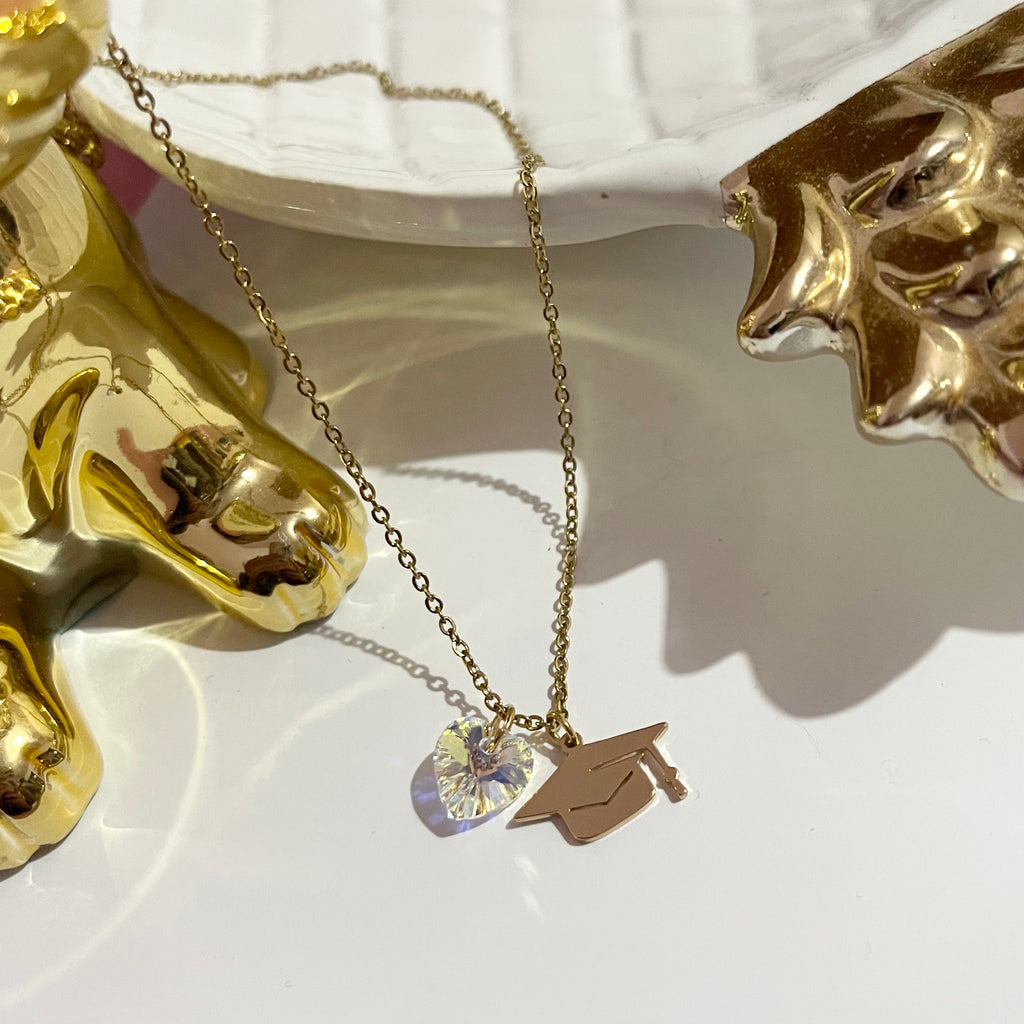 Dije: Corazon de cristal y birrete en chapa de oro.